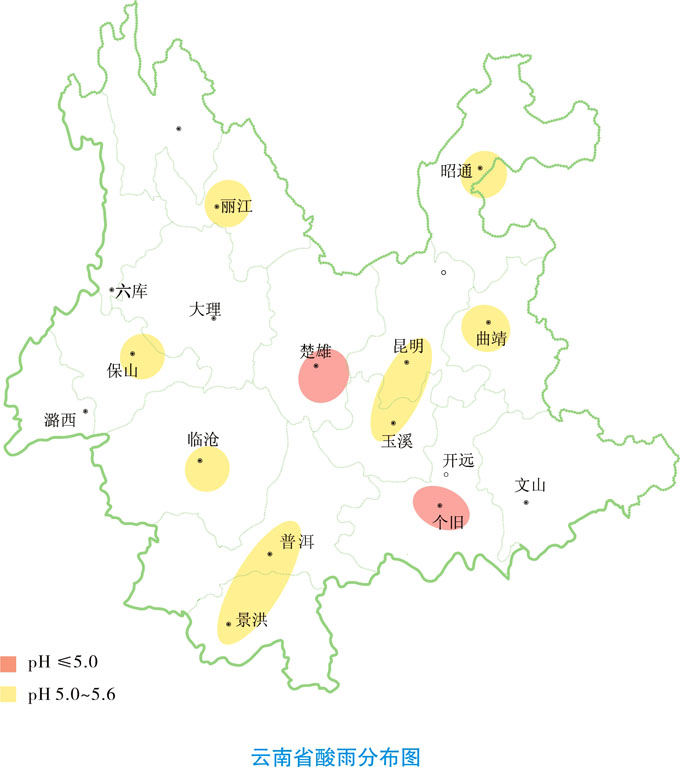 在出现酸雨的11个城市中,酸雨pH平均值在4.27~5.32之间,最低值4.27,出现在个旧市,次低值4.61,出现在普洱市。