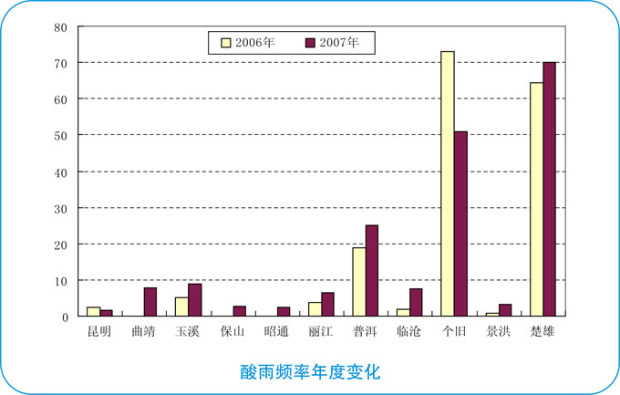 我省2007年开展降水酸度监测的16个主要城市中,出现酸雨的城市有11个,分别是昆明、玉溪、曲靖、保山、昭通、丽江、普洱、临沧、个旧、景洪、楚雄,占68.8%。文山、开远、大理、潞西、六库等5个城市未监测到酸雨。