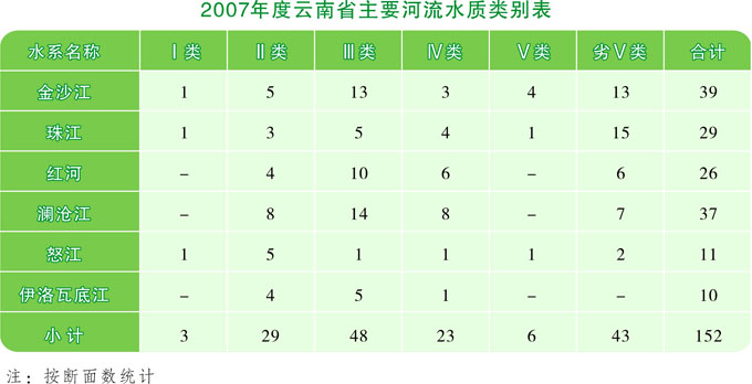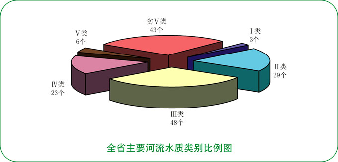 在77条主要河流的152个监测断面中,水质优达到Ⅰ~Ⅱ类标准的断面占21.1%,水质良好达到Ⅲ类标准的断面占31.6%,水质已受轻度污染达到Ⅳ类标准的断面占15.1%,水质已受中度污染达到Ⅴ类标准的断面占3.9%,水质已重度污染劣于Ⅴ类标准的断面占28.3%。