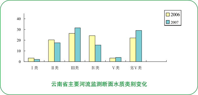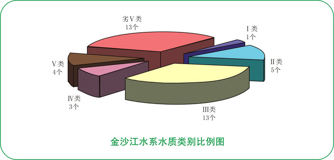 金沙江水系水质总体为中度污染。22条主要河流39个监测断面中,达到Ⅰ~Ⅱ类标准水质优断面占15.4%;达到Ⅲ类标准水质良好断面占33.3%;达到Ⅳ类标准水质轻度污染断面占7.7%;达到Ⅴ类标准水质中度污染断面占10.3%;劣Ⅴ类标准水质重度污染断面占33.3%。