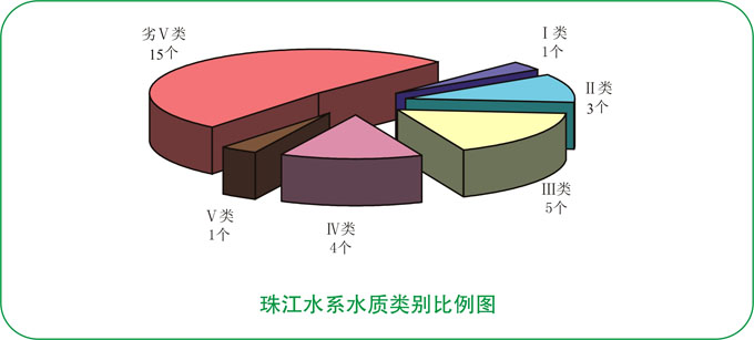 珠江水系水质为重度污染。9条主要河流29个监测断面中,达到Ⅰ~Ⅱ类标准水质优断面占13.7%;达到Ⅲ类标准水质良好断面占17.3%;达到Ⅳ类标准水质轻度污染断面占13.8%;达到Ⅴ类标准水质中度污染断面占3.4%;劣Ⅴ类标准水质重度污染断面占51.8%。