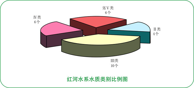 红河水系水质轻度污染。12条主要河流26个监测断面中,达到Ⅰ~Ⅱ类标准水质优断面占15.4%;达到Ⅲ类标准水质良好断面占38.4%;达到Ⅳ类标准水质轻度污染断面占23.1%;劣Ⅴ类标准水质重度污染断面占23.1%。