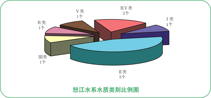 怒江水系水质轻度污染。5条主要河流11个监测断面中,达到Ⅰ~Ⅱ类标准水质优断面占54.5%;达到Ⅲ类标准水质良好断面占9.1%;达到Ⅳ类标准水质轻度污染断面占9.1%;达到Ⅴ类标准水质中度污染断面占9.1%;劣Ⅴ类标准水质重度污染断面占18.2%。
