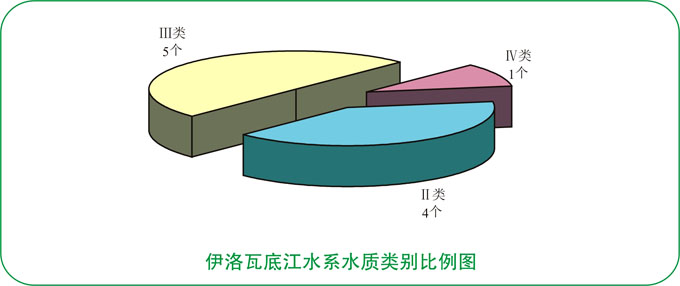 伊洛瓦底江水系水质优。6条主要河流10个监测断面中,达到Ⅰ~Ⅱ类标准水质优断面占40.0%;达到Ⅲ类标准水质良好断面占50.0%;达到Ⅳ类标准水质轻度污染断面占10.0%。