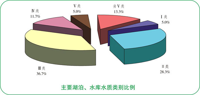 全省开展水质监测的60个湖泊、水库中,Ⅰ~Ⅱ类水质的占33.3%、Ⅲ类水质的占36.7%、Ⅳ类水质的占11.7%、Ⅴ类水质的占5.0%、劣Ⅴ类水质的占13.3%。全省湖库水质总体为轻度污染。